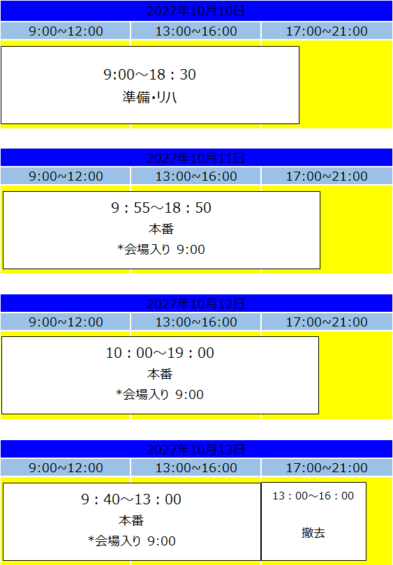 9:00~21:00(1日目設営)、9:00~21:00(2~4日目)